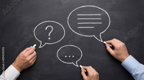 Business communication concept with hands drawing speech bubbles on chalkboard