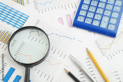 Business concept, calculator, magnifying glass, pen and pencils on financial charts and graphs