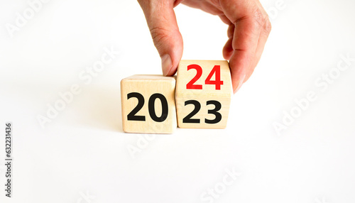 Business concept of 2024 new year symbol. Businessman turns a wooden cube and changes number 2023 to 2024. Businessman hand. Beautiful white background, copy space. 2024 happy new year concept.