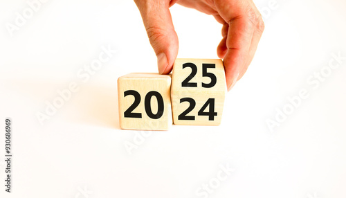 Business concept of 2025 new year symbol. Businessman turns wooden cube and changes number 2024 to 2025. Beautiful white table white background, copy space. Business 2025 happy new year concept.