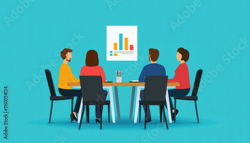Business corporation competition. Four people in a meeting discussing graphs on a bright blue background.