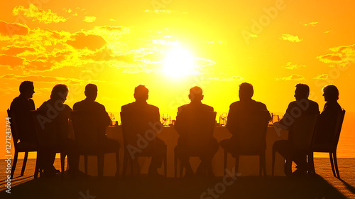 Business discussion at sunset collaborative meeting outdoor restaurant serene environment group perspective