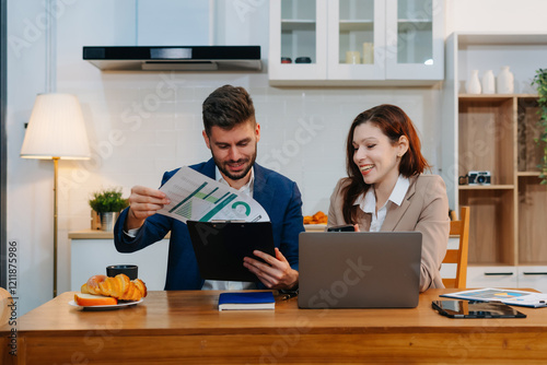 Business documents at kitchen modern office table with tablet and laptop computer and chart and two colleagues working a project or reviewing and discussing a business project.