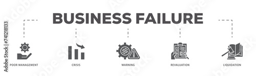 Business failure icons process flow web banner illustration of poor management, crisis, warning, revaluation and liquidation icon live stroke and easy to edit