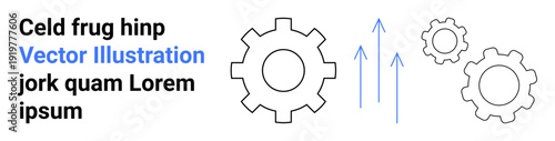 Business growth, industrial progress, development process, teamwork, efficiency, systems. Gears with upward arrows and placeholder text. Business growth and industrial progress symbols
