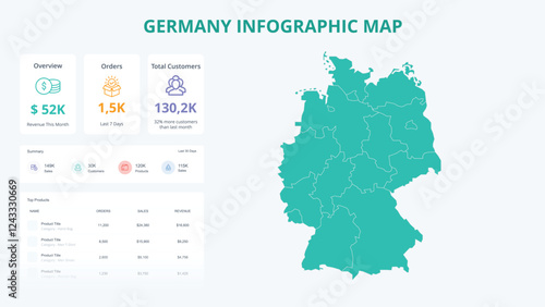 Business Growth Infographic Map of Germany. Orders, Customers, Sales Overview & product Infographic Map of Germany. Easy to edit