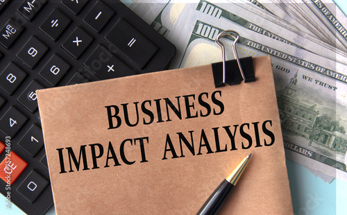 BUSINESS IMPACT ANALYSIS - words on brown paper on the background of calculator and banknotes