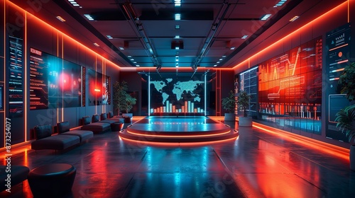 Business innovation summit stage podium with disruptive technology themes, innovation graphics, and visionary speakers. , Minimalism,
