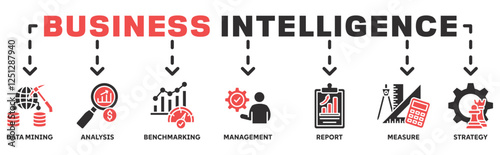 Business Intelligence banner web icon vector illustration concept with icon of data mining, analysis, Strategy, measurement, benchmarking, report and management