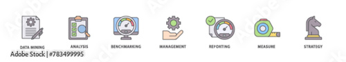 Business intelligence icon packs for your design digital and printing of data mining, analysis, benchmarking, management, reporting, measure, and strategy icon live stroke and easy to edit