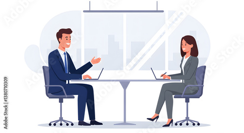 Business Job Interview concept. Vector cartoon illustration of a man in suit asking questions and a woman answering them while sitting at a table