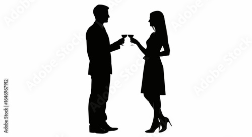 Business man and woman celebrating with a glass of champagne. Vector silhouettes of a young couple who toasts to the birthday celebration, success, anniversary stock