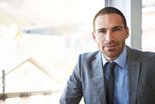 Business man, portrait and corporate professional in an office ready for work at a company window. Serious, suit and investment manager with confidence at an accounting firm with a male executive