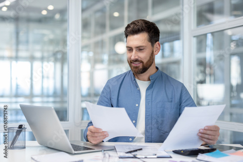 Business man with a beard smiling while reviewing financial documents, managing paperwork, and using a laptop at his desk in a modern corporate office, symbolizing planning and success
