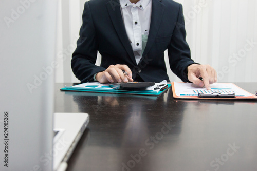 Business man working at office with laptop, tablet and graph data documents on his desk.