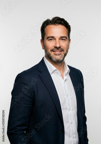 Business manager in a sleek jacket, standing confidently with a happy grin