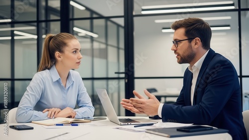 business, meeting, office, discussion, laptop, document, collaboration, planning, strategy, teamwork, professional, corporate, people, man, woman, male, female, caucasian, partnership, work, desk, communication, technology, modern, interior, financial, advice, consulting, mentor, learning, career, success, analysis, research, smart, interview, agreements, executive, serious, focused, confident, professional