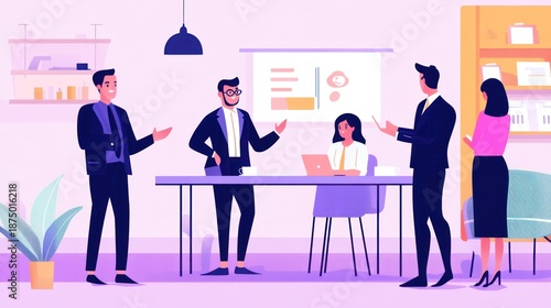 business, meeting, presentation, office, teamwork, collaboration, discussion, people, team, work, professional, corporate, conference, planning, strategy, analysis, communication, success, leadership, manager, employee, colleague, brainstorming, idea, concept, project, solution, growth, development, modern, illustration, vector, graphic, design, style, minimalist, clean, colourful, vibrant, laptop, desk, chair, suit, formal, attire, indoor, room