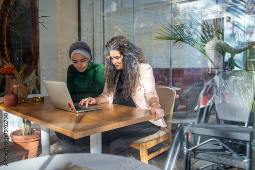 bakery, business, businesswoman, cafes, cafeteria, candid, cheerful, clothing, hot drink, colleague, dessert, diversity, food, friends, fun, headscarf, indoor, islam, laptop, lifestyle, meeting, minority, morning, muslim, pastry, people, real, eatery, shop, smiling, student, talking, teamwork