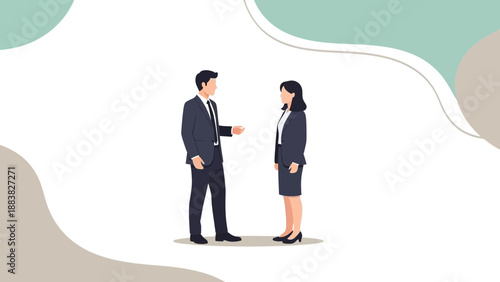 business, people, work, meeting, teamwork, discussion, professional, collaboration, office, conversation, corporate, employee, partner, man, woman, suit, attire, modern, illustration, clean, background, minimalist, design, strategic, planning, brainstorming, session, career, growth, job