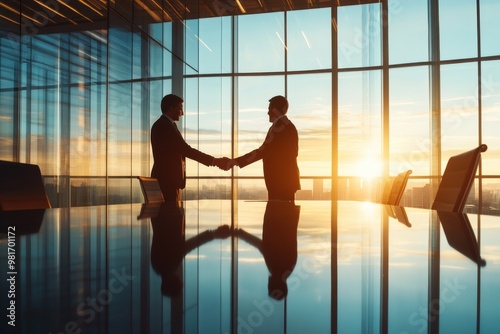 business, meeting, executive, shaking, hand, conference, table, sleek, large, window, soft, sunlight, filtering, modern, tower block, office, setting, professional, handshake, corporate, negotiation, agreements, deal, partnership, office space, collaboration, teamwork, success, glasses, bright, contemporary, city view, businessperson, conference room, business attire, formal