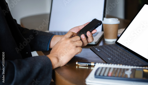 Business men working laptop computer and holding smartphone with coffee cup on table in coffee shop or cafe, working from cafe, freelance work concept.