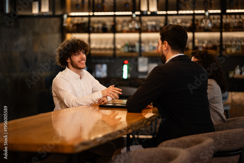 Business partners having informal meeting and discussion in bar