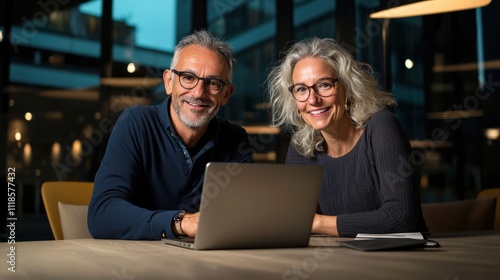 Business partners, mature diverse duo, Latin man and European woman, working together at table, laptop-focused collaboration in a sleek office