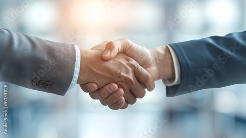 Business partnership agreement, two professionals engaging in a firm handshake, conveying trust and collaboration in a modern office environment