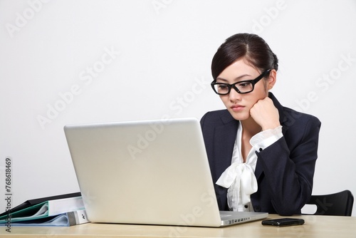 technology, indoor, joy, laptop, lifestyle, portrait, carefree, computer, computer keyboard, notepad, education, mobile phone, information superhighway, freedom, 20s, leisure, desk, smiling, people, book, adult, shirt, success, working, color image, image, photo, full suit, female, business, occupation, staring, businessperson, woman, businesswoman, beautiful, missy, young adult, modern, white background, one person, well-being
