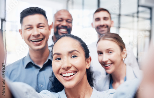 Business, people and happy in office with selfie for break or team building, memories and fun. Employees, portrait and diversity with smile or excited for teamwork or collaboration for social media
