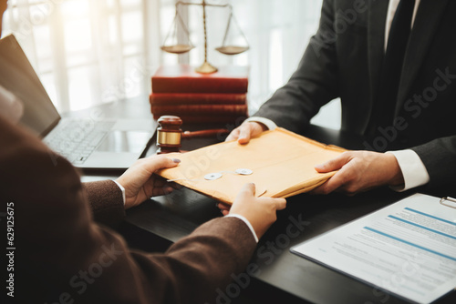 business people and lawyers discussing contract papers sitting at the table. Concepts of law, advice, legal services. in morning light.