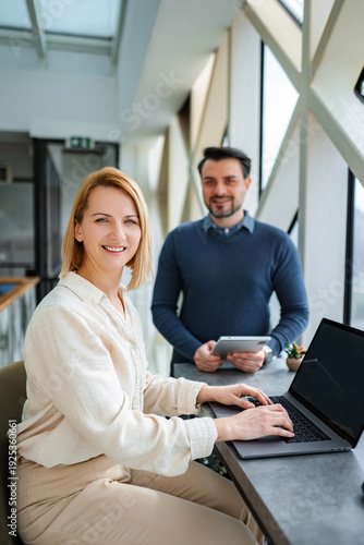 two people, adults only, teamwork, smiling, business, professional occupation, expertise, businessperson, colleague, working, technology, office, laptop, success, cooperation, communication, businesswoman, modern, new business, entrepreneur, desk, casual clothes, happiness, cheerful, meeting, discussion, businessman, people, adult, manager, woman, man, well-dressed, indoor, day, bright, sunlight, confidence, full frame, front view