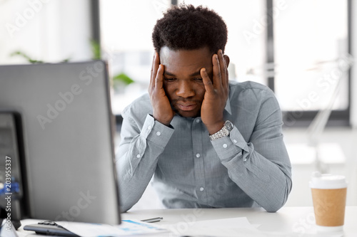 business, people, deadline and technology concept - stressed african american businessman with papers and computer working computer at office