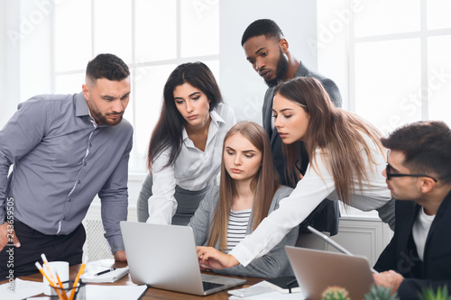 Business people gathered around laptop discussing ideas