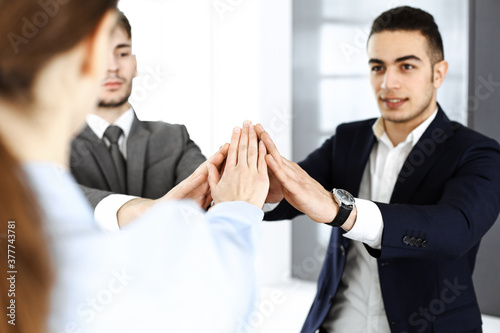Business people group showing teamwork, joining hands and giving five to each other in modern office. Success concept