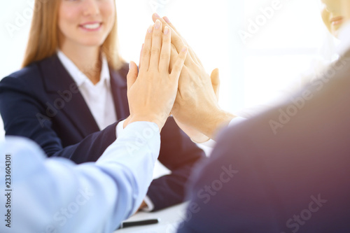 Business people happy showing teamwork and giving five showing unity and partnership. Success and friendship concepts