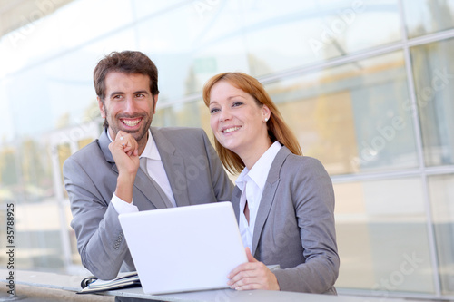 business, businessman, businesswoman, team, teamwork, workteam, meeting, colleague, man, woman, manager, laptop, computer, connection, partner, partnership, standing, outdoors, adult, caucasian, agenda, appointment, happy, cheerful, aerodrome, congress, business travel, salesman, salesgirl