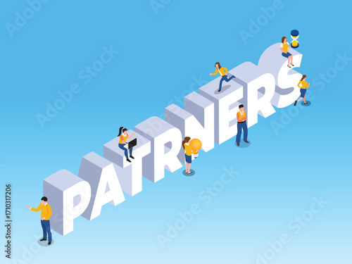 three-dimensional, vector, isometric, illustration, partnership, partner, collaboration, teamwork, business, people, professional, corporate, success, strategy, network, connection, alliance, support, cooperation, global, team, work, group, man, woman, cartoon, letter, text, typography, idea, light bulb, laptop, hourglass, communication, joint, venture, project, solution, synergy, management, development, finance