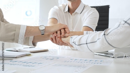 Business people team joining hands over workplace documents, symbolizing collaborative spirit and shared workplace success, close up view