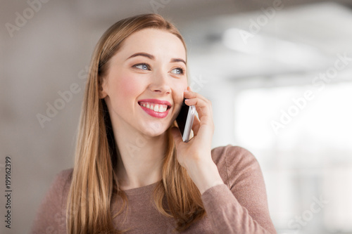 business people, technology and corporate concept - happy smiling businesswoman calling on smartphone at office