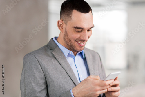 business people, technology and corporate concept - smiling businessman with smarphone at office