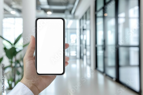 business, person, hand, holding, smartphone, white, screen, bright, modern, office, background, technology, digital, mobile, device, touch, corporate, workspace, professional, businessperson, indoor, communication, tech