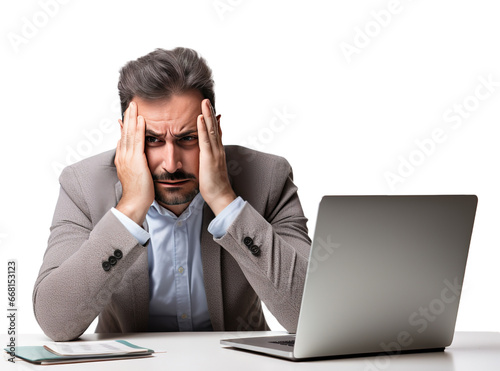 business person sits at their office desk, engrossed in work on their laptop, stress of the job is evident as they rest their hands on their head, png transparent