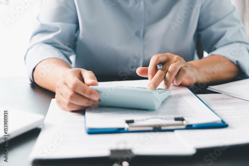 Business person with contract law and paper work for business finance, loan application form, contract real estate and insurance concept. signing contract, working on desk, business document