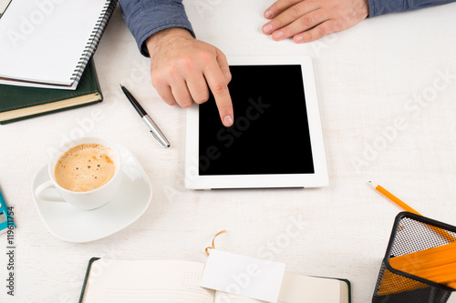 tablet, banner, screen, blank, empty, hot drink, cup, finger, click, clicking, laptop, table, home, employment, business, notebook, designer, digital, technology, computer, desk, professional, architect, career, online, job, freelance, man, desktop, workplace, hand, notepad, entrepreneur, businessman, shirt, cyberspace, occupation, finance, checked, freelancer, creative, creativity, connection, squeeze, person, sitting, working, office