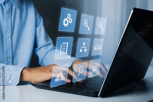 Business person working on a laptop with digital icons representing business processes and management modern technology and workflow automation concept