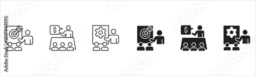 business, presentation, icon, meeting, conference, businessman, plan, manager, management, seminar, set, presenter, explanation, project, briefing, information, agenda, schedule, work, vector, design, illustration, web, team, leadership, communication, training, discussion