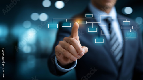Business process workflow automation with flowchart faceless businessman in background organizational management operational control corporate efficiency defocused setting