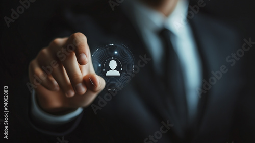 Business professional engaging with a futuristic user profile icon on a digital interface, showcasing advanced customer relationship management and personalized service strategies.